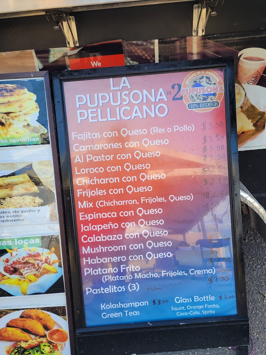 Finally, the Pan Con Pollo, a flavorful chicken sandwich, rounds out the diverse selection of menu items. Whether you're looking for a quick snack or a full meal, La Pupusona Pellicano #2 has something to satisfy every craving, all at reasonable prices.